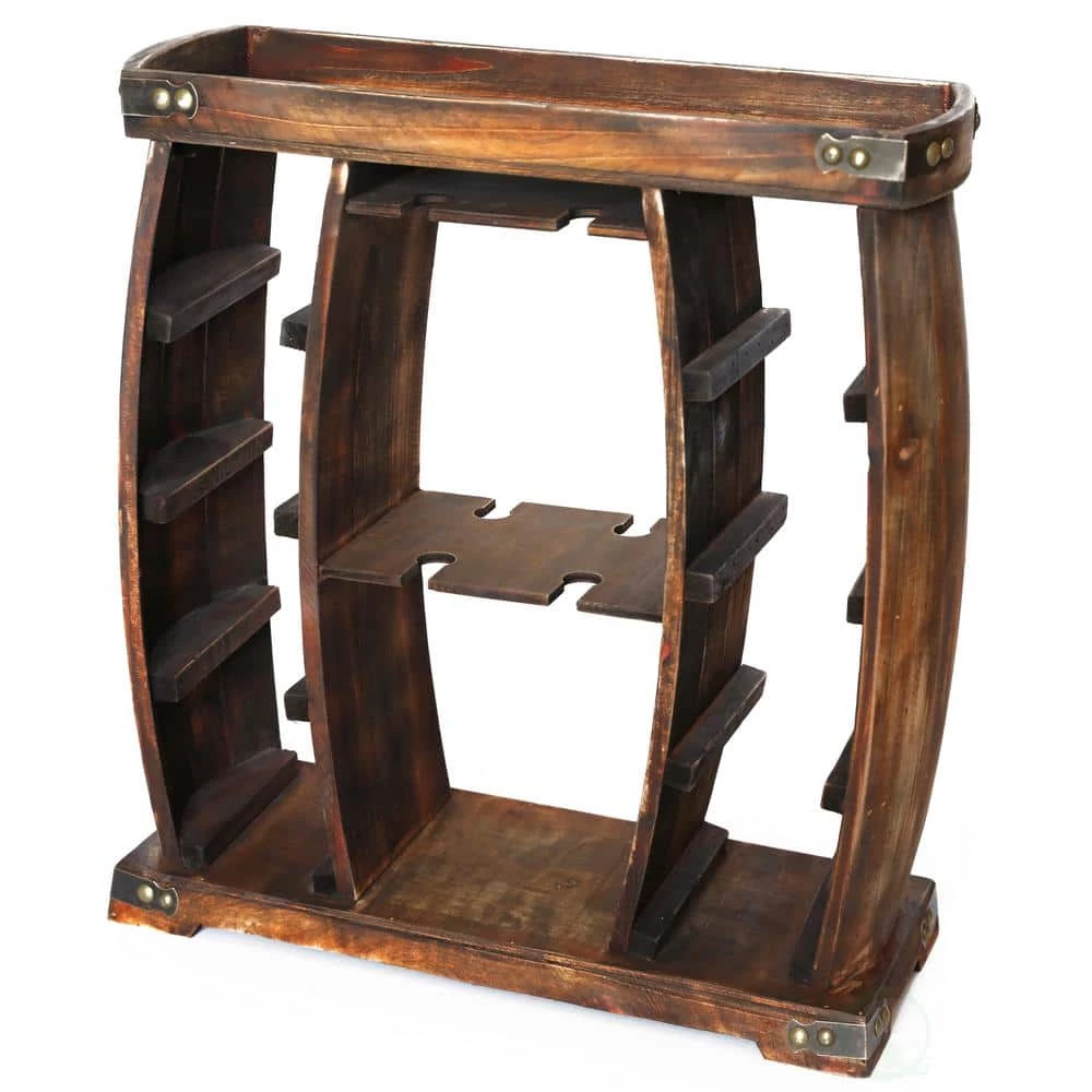 This wooden barrel shaped wine rack will add a final touch to your dining room or wine caller. Designed to hold up to 8 bottles and wine glasses, it provides convenient and practical storage as well as classic elegant style. Freestanding design keeps the wine stand steady and your wine collection secure. Use the shelf at the top of this decorative wine rack as a handy place to set wine glasses.