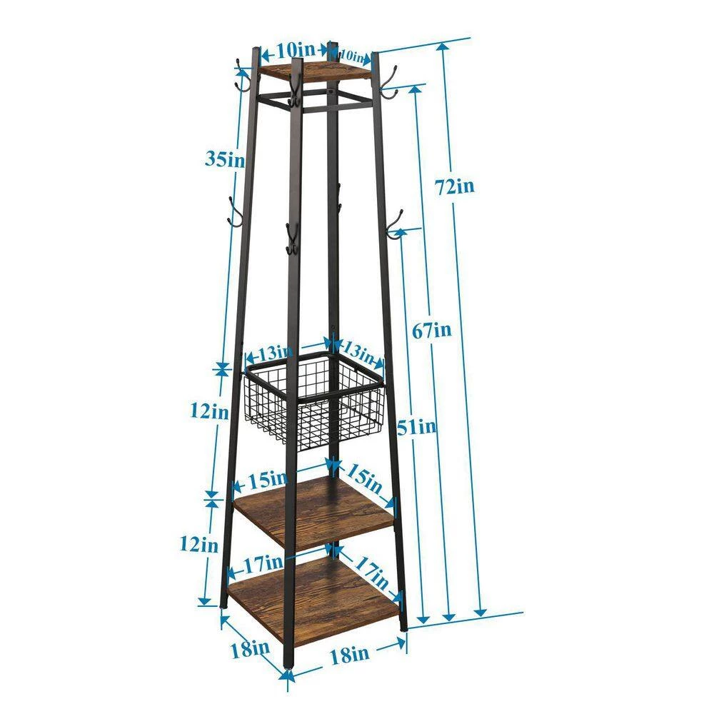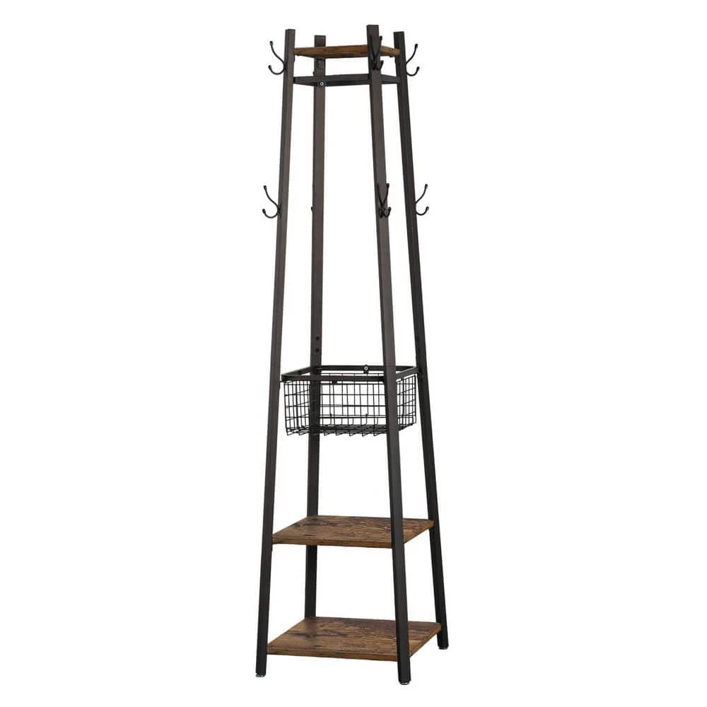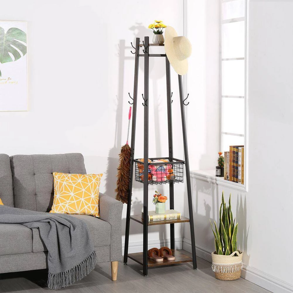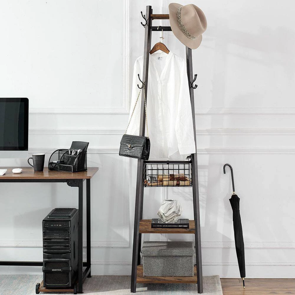 A Coat Rack, More of a Work of Art Seemingly Small, Actually Multifunctional: The footprint is very small and very easy to move around. Smaller rooms and households can have a higher quality of life. You deserve to have this coat rack. Style and Stability Meet Here: 2-layers of brown shelves of different sizes and slightly tapered black steel legs form a stable structure, adding a touch of industrial charm to your room. Easy to Clean: The flat surface is smooth and free of dead ends, easy to clean. This exquisite coat rack is suitable for any household type.