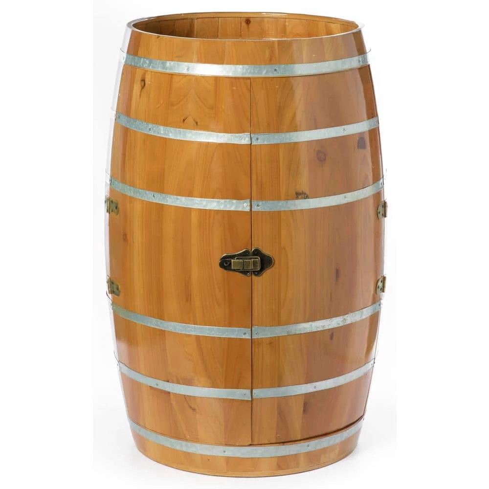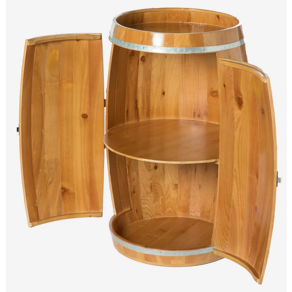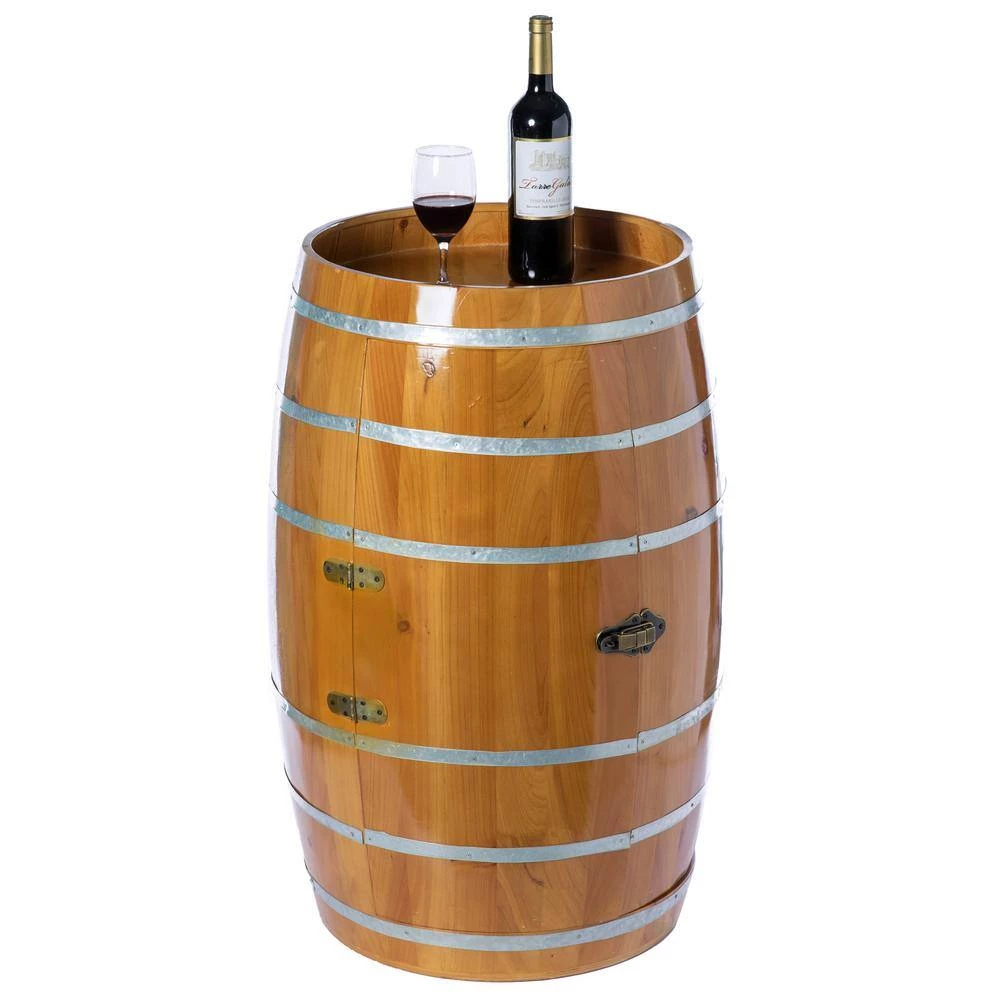 Invite rustic vibes into your home and bar furnishing with this Beautiful wood finished Wine Barrel Bar Cabinet. The bar cabinet features enough space to store bottles as well as top surface space for convenient access. For extra protection, the bar cabinet includes a latch to keep your wine collection secure.