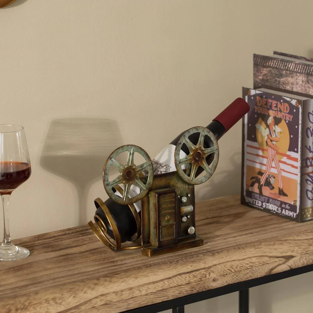 Complete the decor of your room with this vintage wine holder. Composed out of durable metal material, this wine holder offers durability and practical function for continual use. Vintage metal designed base and film projector shape creates a decorative appeal to your room decor. Use this wine holder to store a wine bottle and as a centerpiece display to keep wine handy. This is a truly unique high quality functional decor.