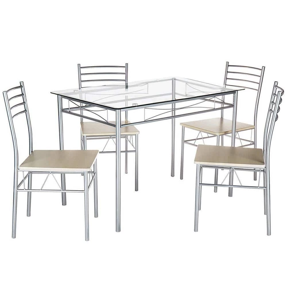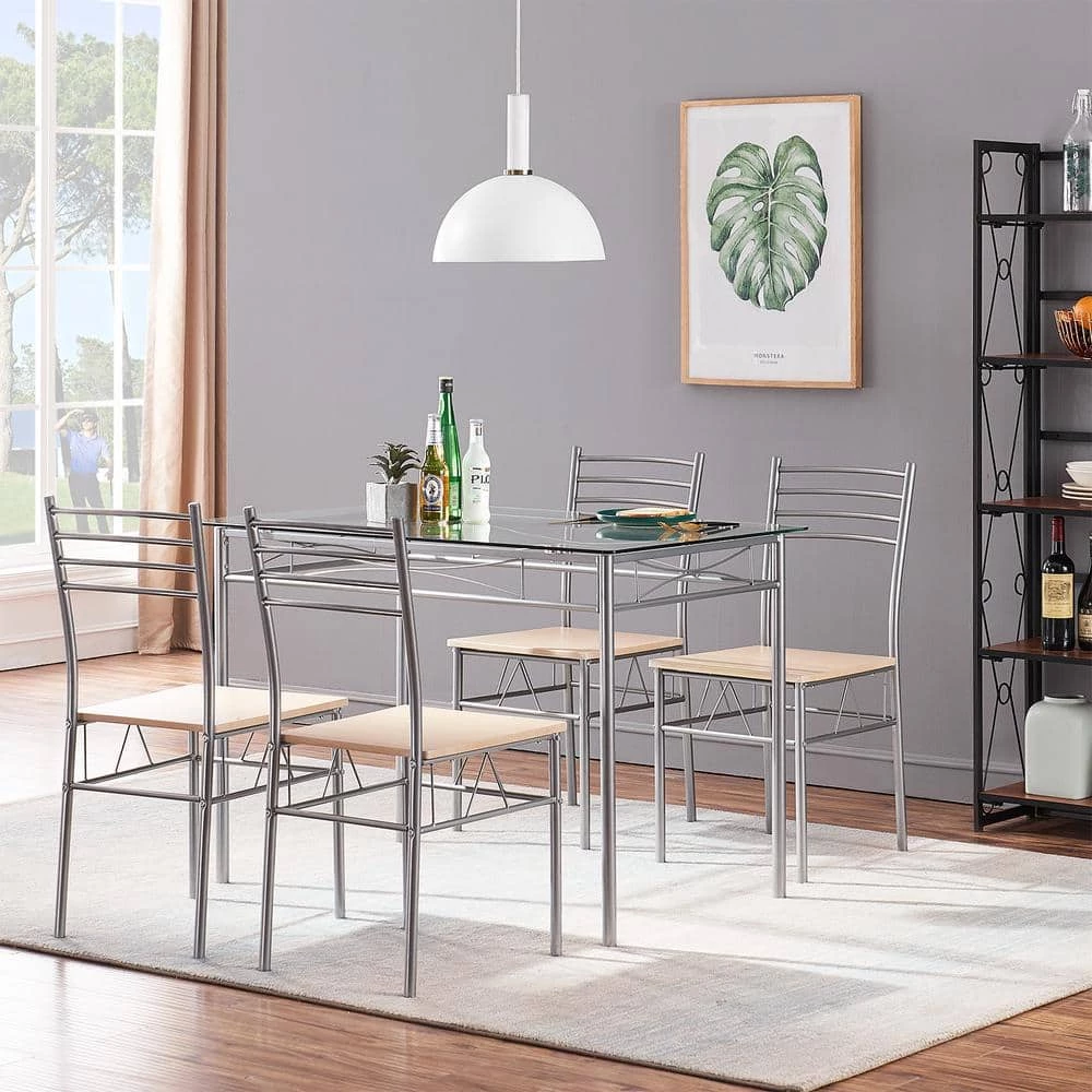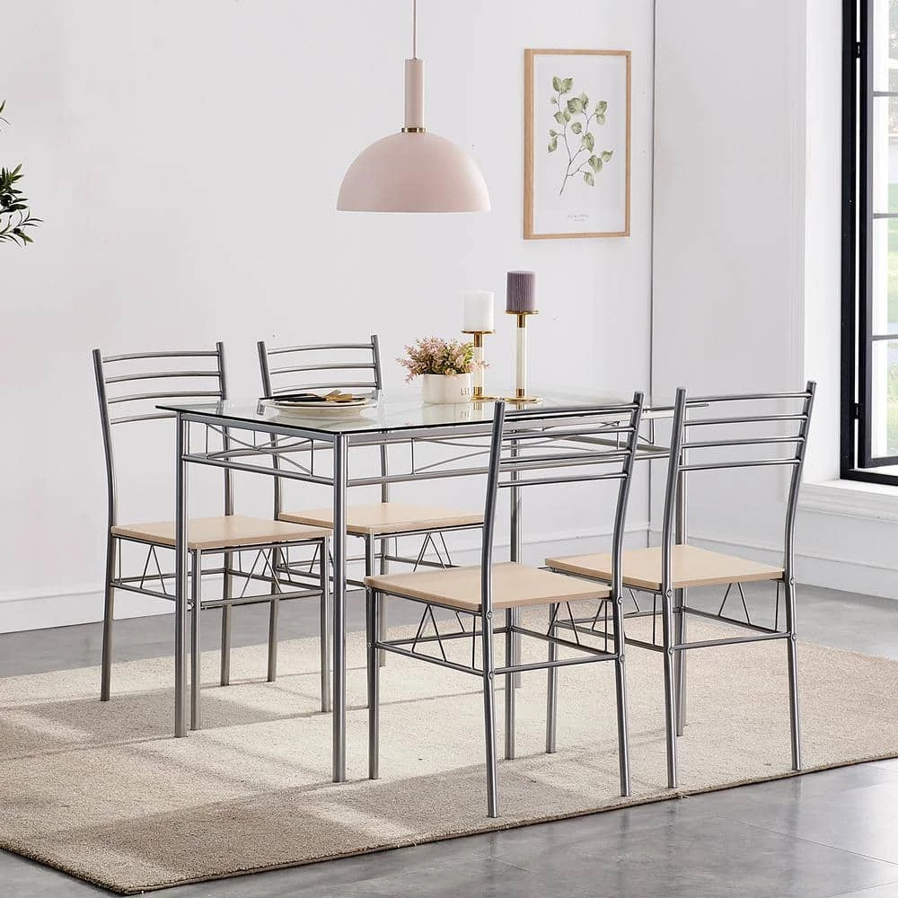 - 💐【5 PC Combination of Furniture】5 piece dining table set includes 1 table and 4 chairs. It is sold in a complete set. And the set comes with a glass top table and 4 cushioned chairs. The 5 pc dining table set could meet the daily needs of a family of four. Enjoy the leisure time that eat the dinner with the whole family! It is a ideal option for you.