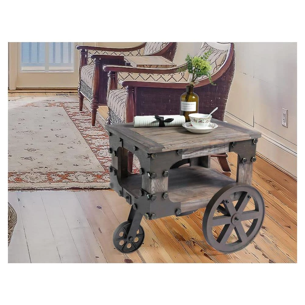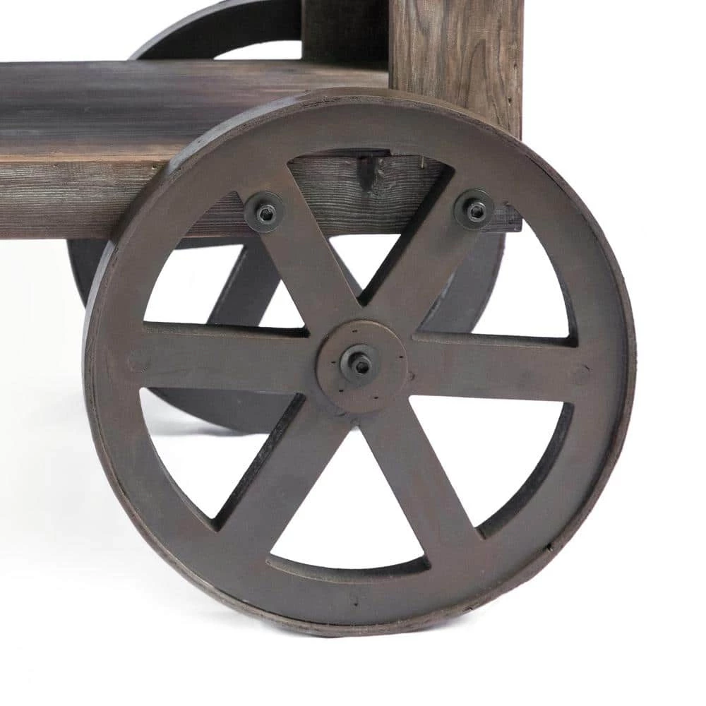 Introduce a realistic vintage element to your home decor with this rustic accent table that looks just like an antique style wagon. Earthy color tones, antiqued metal detail, various sized wheels, and organic wood brings together vogue and vintage elegance together. Two storage shelves provide plenty of surface space for trinket display or storage. Situated at the side, but the center of your room’s attraction.