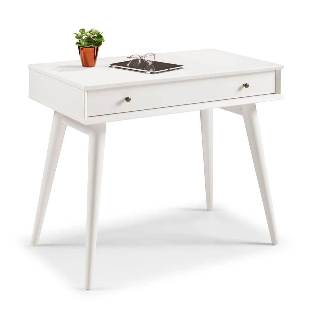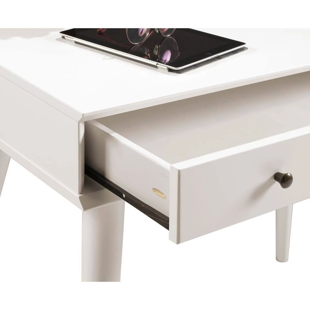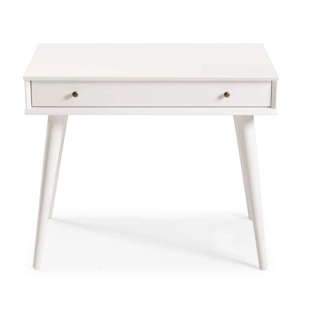 Camaflexis Mid-Century Modern Desk combines functionality with sleek lines and geometric forms. It offers a simple sophistication to any modern space. With a 100% solid wood construction this desk is built to last. In addition, a protective finish highlights the natural patterns of the wood grains. The desks clean design and round tapering legs make it the perfect complement to the Camaflexi Mid-Century Modern Bed collection. Furthermore, the large desk top offers plenty of room for working at home. A single, extra-large drawer provides ample storage space. The drawer is equipped with metal roller glides with safety stops for smooth and effortless motion. The desk is available in two distinct finishes Bright White and Castanho Brown. Customize your space with the natural simplicity and beauty found in these Mid-Century Modern Bed Side Tables.