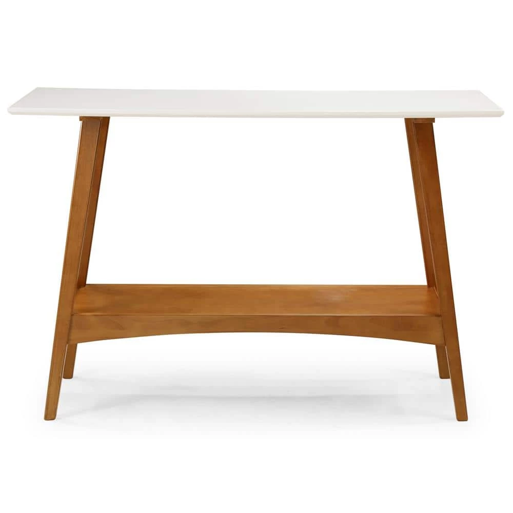Create that timeless and constantly inviting design in your entryway, living room or just about any room with this Mid-Century Modern Console Table. Crafted of 100% solid wood, this piece features a fresh white top of engineered wood to add just that touch of class and is a perfect home for your pictures, flowers or resting spot for your handbag. With the open lower shelf, the display options are endless. The neat, uncluttered look with sleek line and geometric forms epitomizes simplicity in its nicest manner, which can keep you pleased for many years to come.