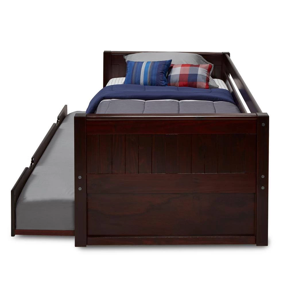 The perfect twin size day bed for kids or teens to curl up on for an afternoon nap, or an exceptionally cozy night’s sleep. The classic panel style featured in our bright white, multi-step, protective finish, is as handsome as it is long-lasting. This built smart bed is constructed of solid wood and includes a slat roll foundation, reinforced with our unique, extra sturdy, center rail support system. Our trundle provides an additional bedding option. Our modesty panels are included to complete the elegant look. Looking for a change? Remove the rear rail and you have twin bed. Flexibility is what we are all about! Camaflexi offers the best in sturdy, eco-friendly and healthy bedroom furniture for your growing child’s needs.