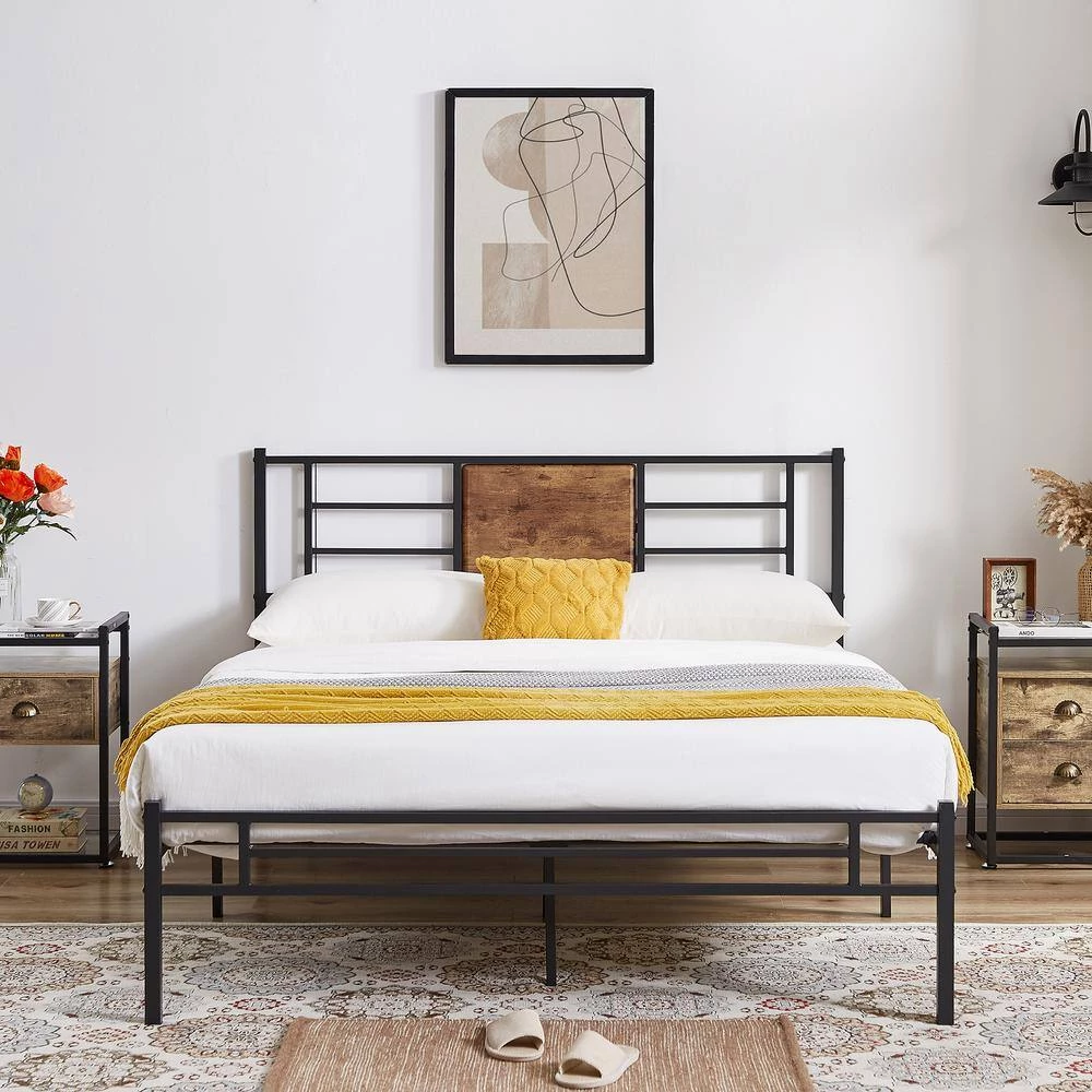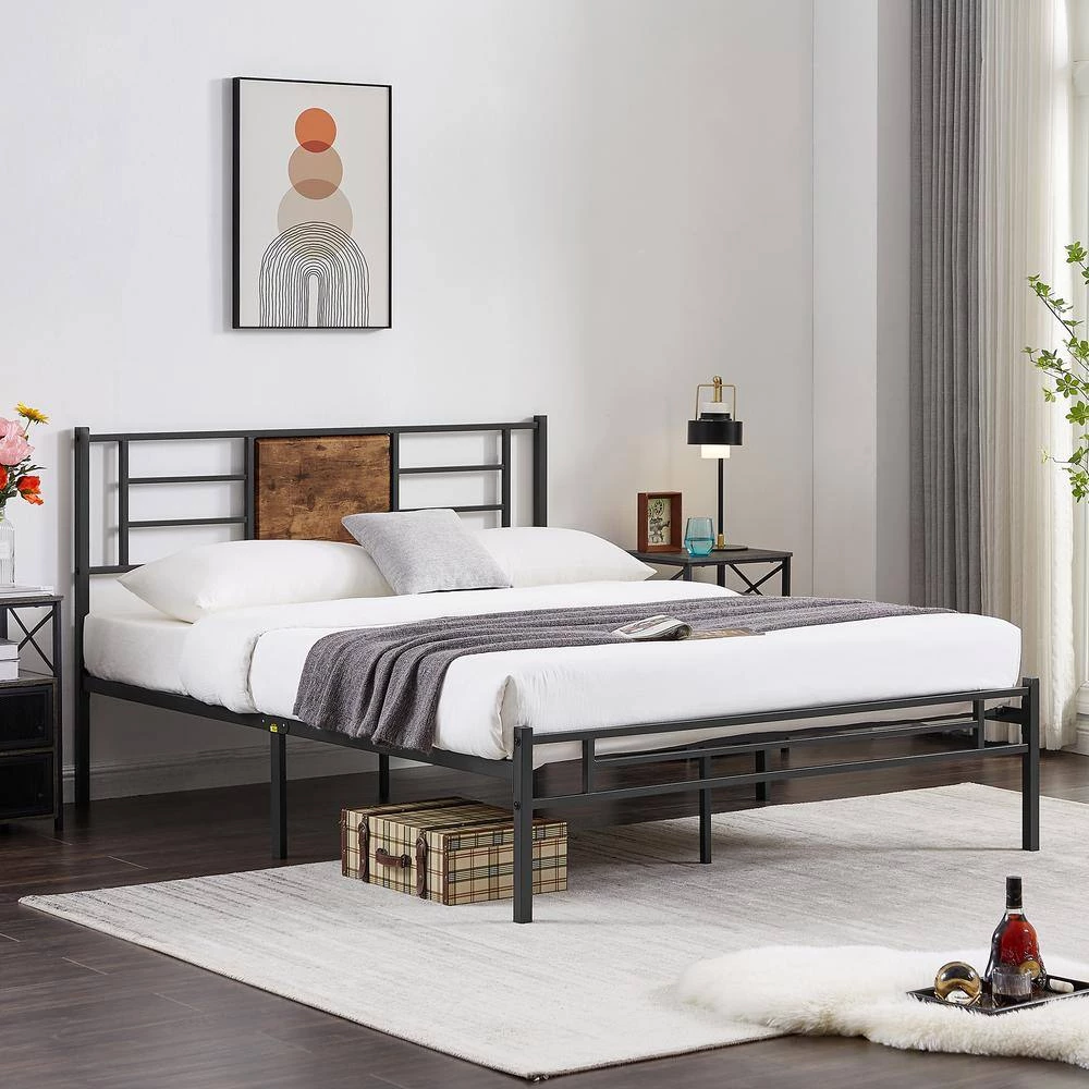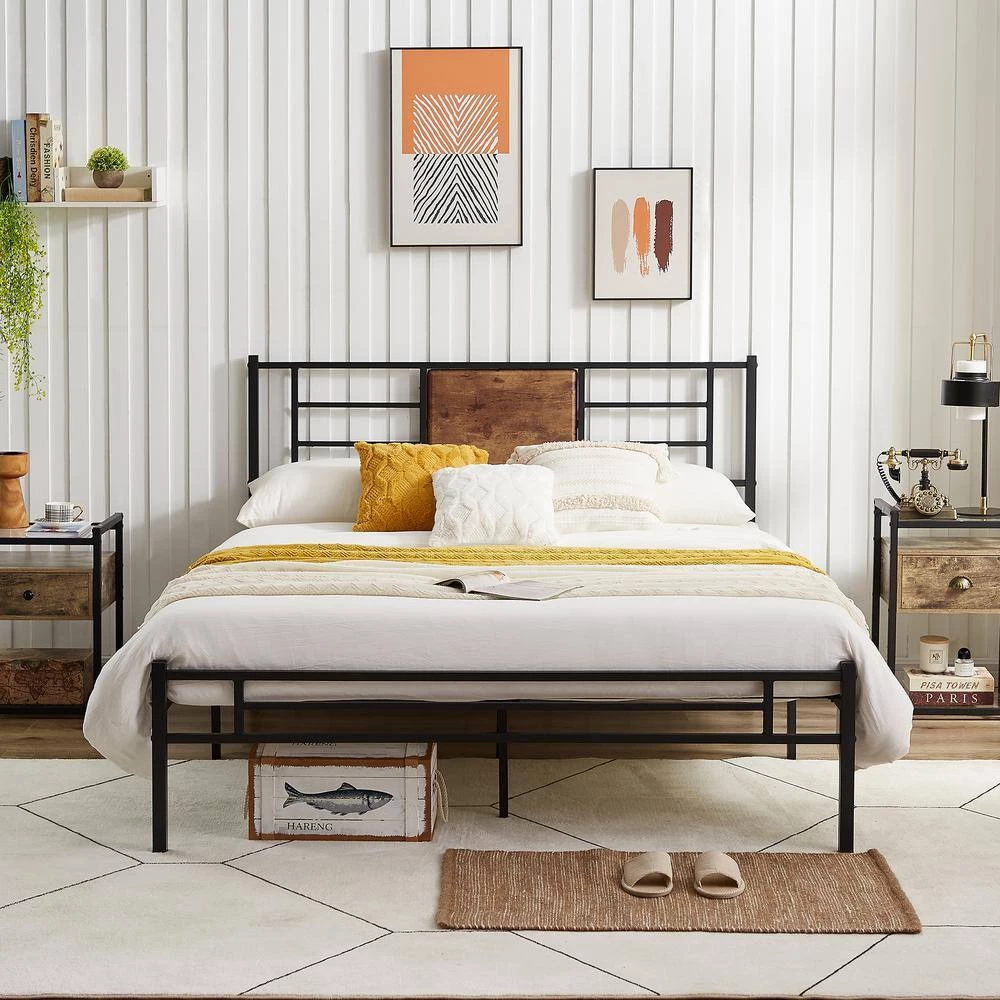 The headboard and footboard are made of 1.2 in. W high-quality steel pipes. The extremely high strength and safe design ensure durability and stability. It is firm and does not creak and you can enjoy a sweet sleep. The board is made of durable P2 grade MDF wood, which is strong, waterproof and scratch-resistant. The optimized and upgraded version of the square tube design bed frame and retro board add scenery to your bedroom. High temperature treatment powder painting process to avoid paint peeling or rusting. Each part of the bed frame is welded firmly and fixed with heavy-duty screws to prevent cracking. We provide the rubber strip pressed the slats to prevent noise. Plastic foot plugs added to the bottom of the bed feet will never scratch your beloved floor.
