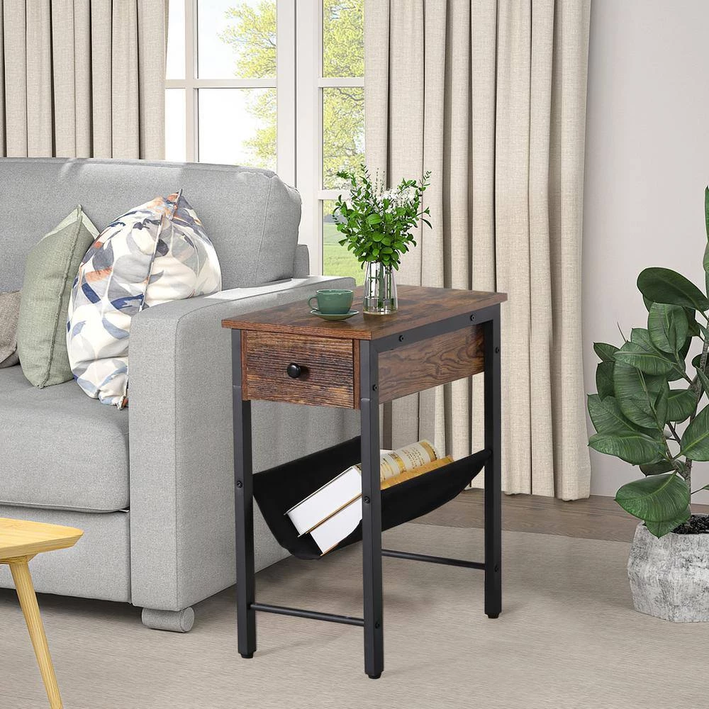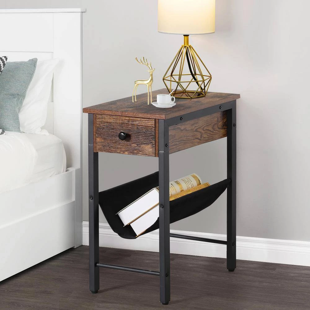 - Looking different: narrow end table choose to use the classic combination of black and brown-the wooden board in rustic brown, and both the metal frame and the linenette fabric storage bag are in black, this is a great bedside table you will like