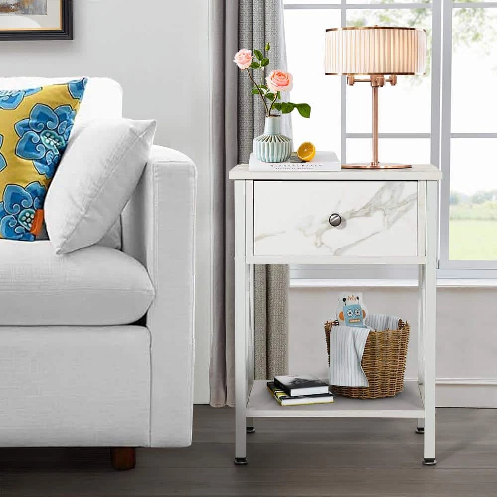 - Well designed: top and bottom open shelf gives sufficient storage room for storing and displaying one drawer with handle offers ample room for other stuff, your snacks, drinks, lamp, magazines, and more will have their home